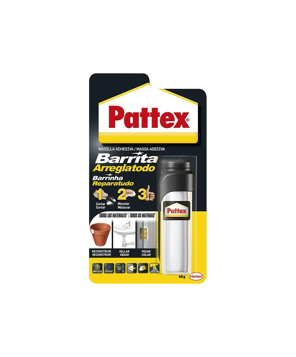 Barrinha Pattex extra forte para restaurar, reconstruir, selar, colar, reabastecer e fixar todo o tipo de materiais em casa. Respira como argila de modelar, endurece como pedra, aplicada em 3 minutos e endurecida em 5 minutos. Pode ser polida, perfurada, pintada ou envernizada. Ideal para pedra, tijolo, gesso, cerâmica, madeira, aço, alumínio, pvc, vidro, plástico, cortiça e espelho.