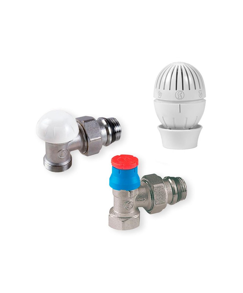 Kit para radiadores que inclui uma válvula termostatizável, um retentor com ligações por adaptador e também uma cabeça termostática R470.