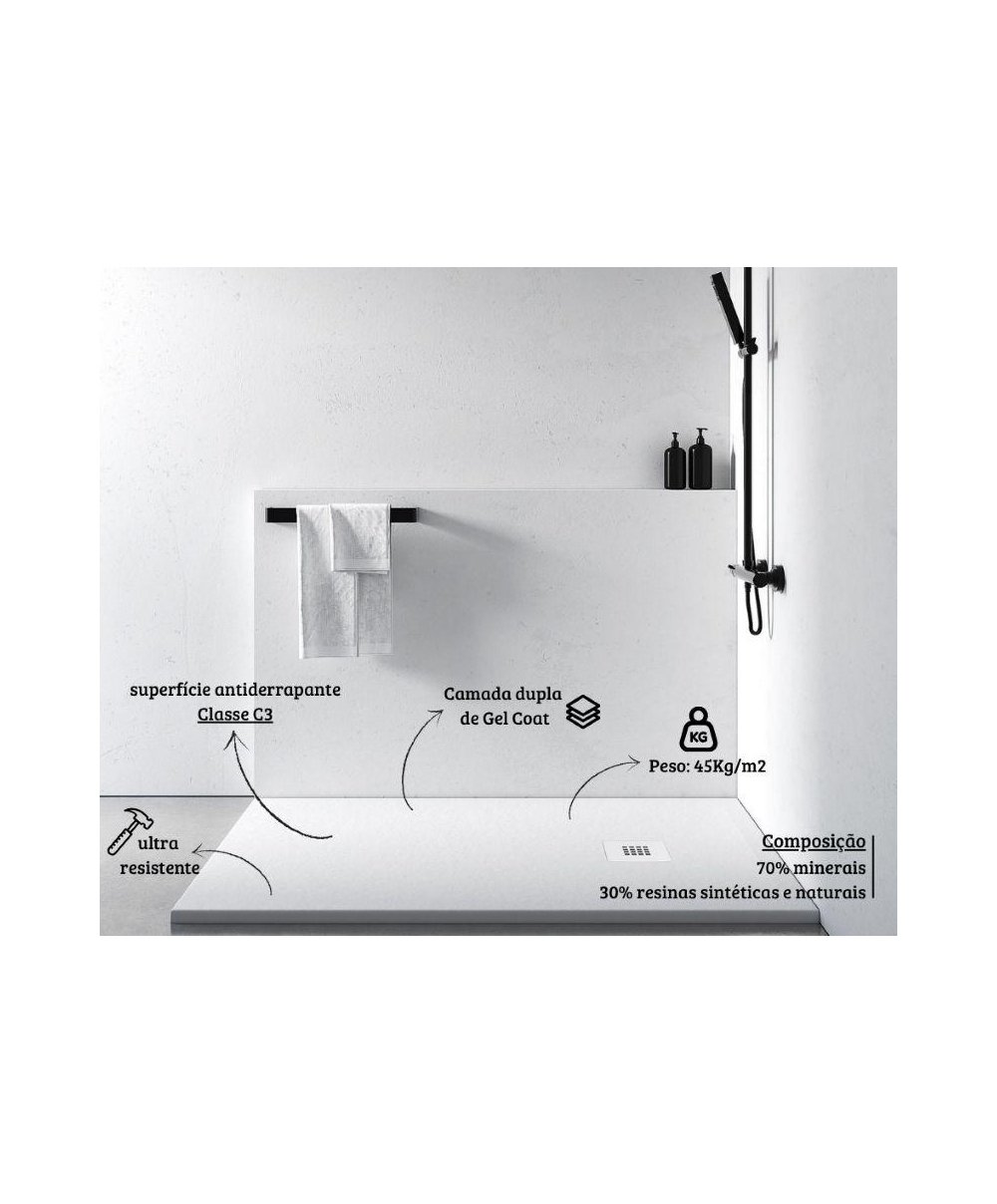 Esta base de Duche Cubo da Casa Alves tem de 90cm de comprimento e 80cm de largura e combina design moderno com máxima resistência e funcionalidade. Produzida com uma composição de aproximadamente 70% minerais e 30% resinas sintéticas e naturais, apresenta uma superfície antiderrapante classe 3 (certificada segundo a norma ENV12633) que assegura total segurança no duche.