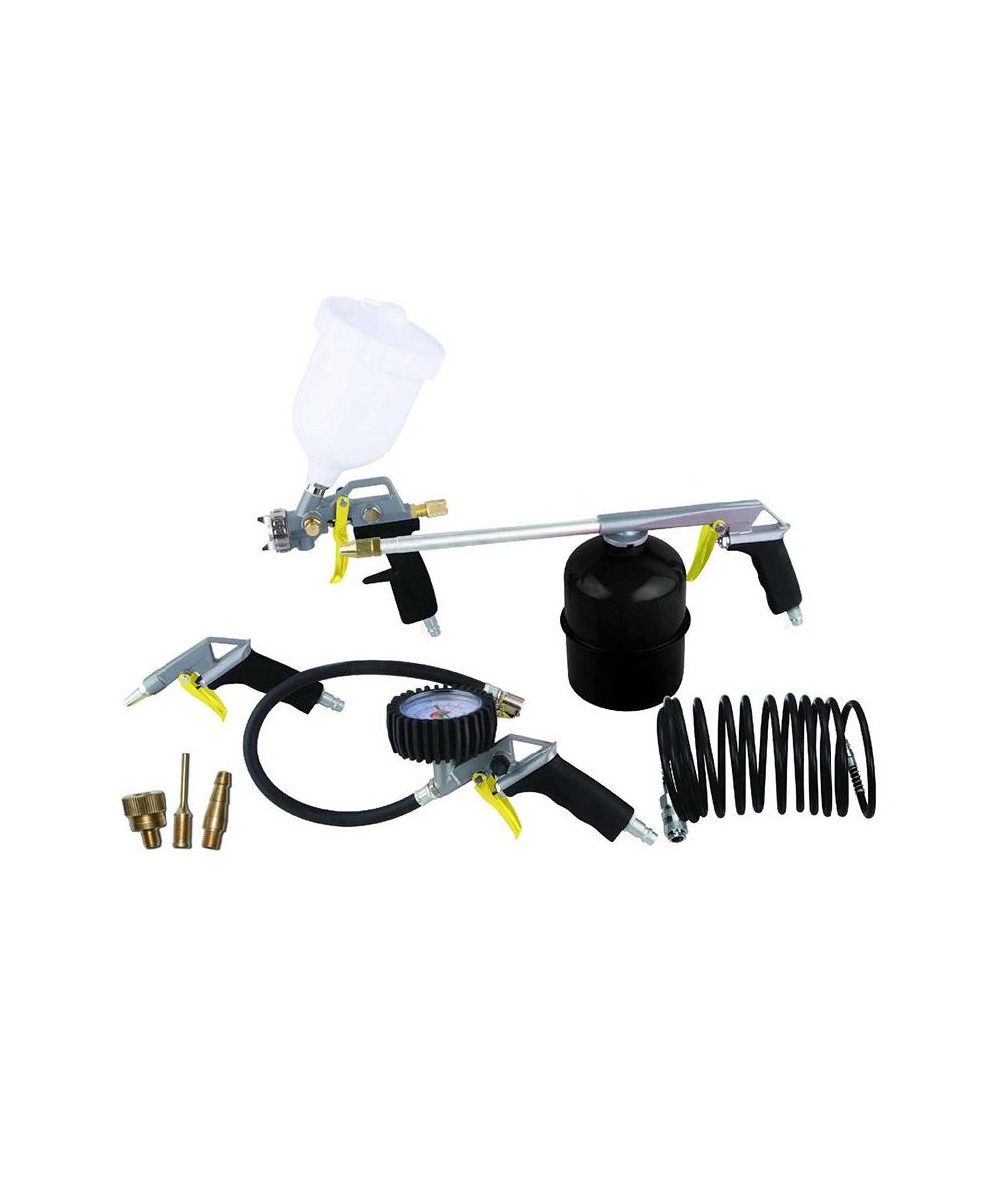 Apresentado numa robusta caixa de cartão, inclui uma ficha universal compatível com a maioria dos compressores do mercado. Este kit é composto por uma pistola de ar, ideal para limpeza de áreas difíceis e remoção de poeira; uma pistola de enchimento, perfeita para pneus e equipamentos infláveis; uma pistola de pintura, que permite uma aplicação uniforme e eficiente da tinta; uma espiral de 5 metros, que proporciona excelente alcance sem perder pressão do ar; e uma pistola de óleo, essencial para aplicação de óleo ou lubrificantes em peças e mecanismos.
