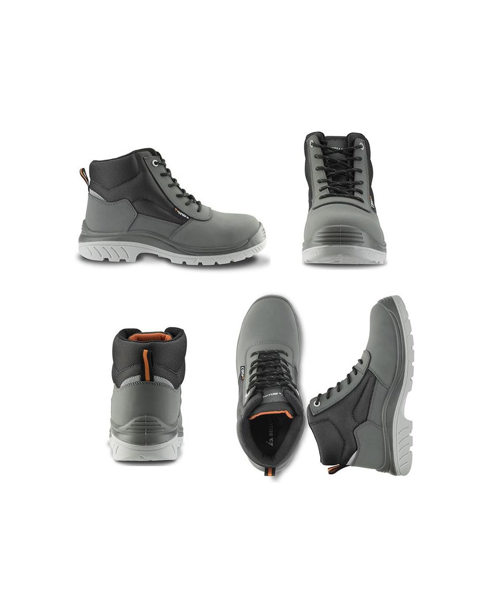 Bota de segurança Comp+ S3, com palmilha antiperfuração têxtil e biqueira de compósito, em pele nobuck cinzenta, resistente à penetração e absorção de água, com sola e detalhes em dois tons de cinzento e elementos refletores na sola cor de laranja. A sua estrutura é larga, é cómoda, leve e flexível. Para armazenamento, transporte, indústria e construção.