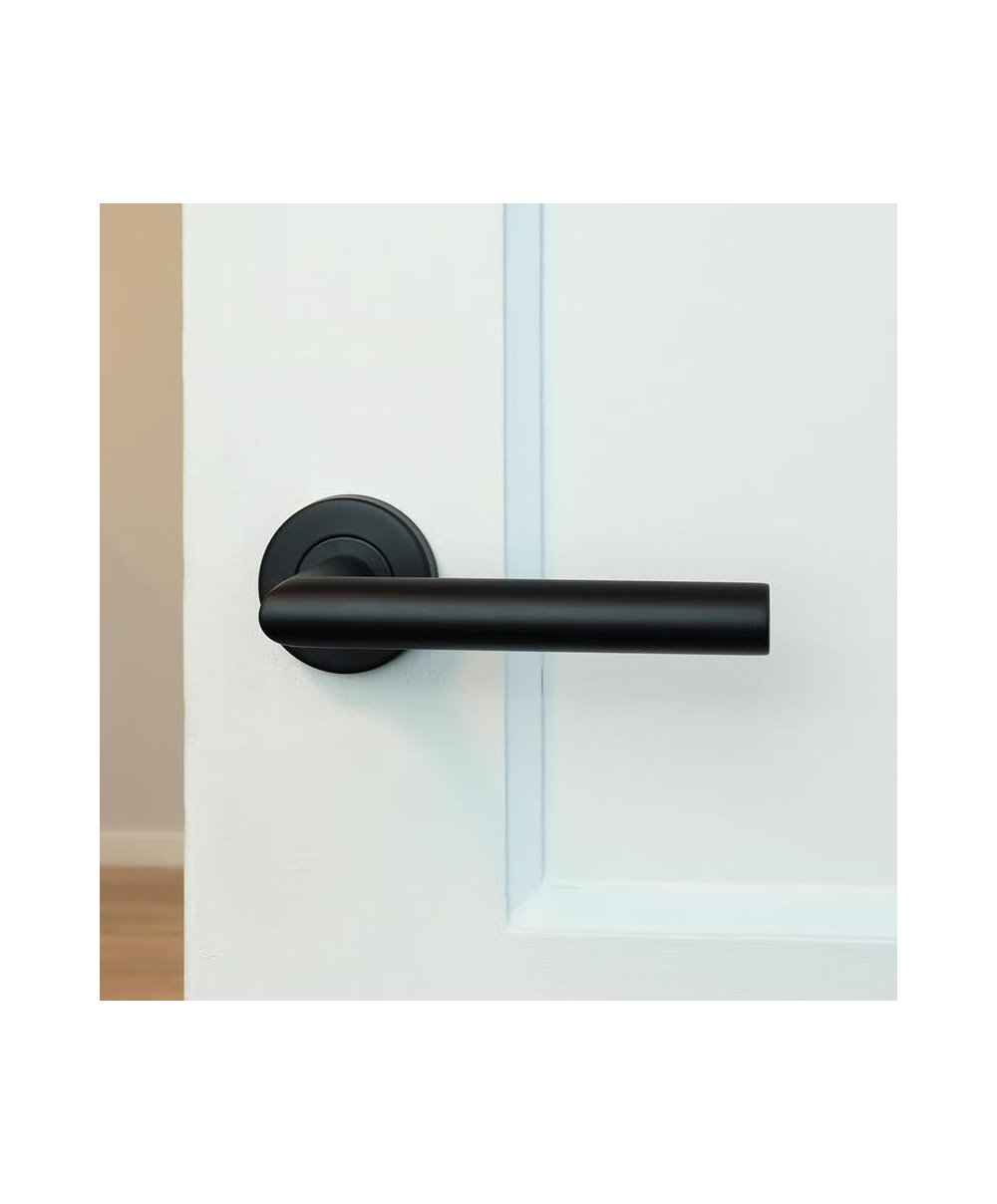 Puxador de porta preto em aço inox satinado com roseta de 6 mm e roseta Ø52 mm com mola compensadora, garantindo maior estabilidade e conforto de utilização. Inclui entrada de chave e quadra 8×8 mm, com parafusos de fixação passantes para uma instalação segura e duradoura.