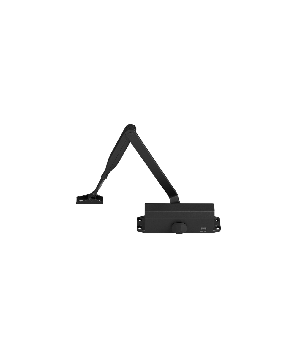 Mola de porta aérea hidráulica de sobrepor com braço standard sem paragem, em alumínio com acabamento preto RAL 9005. Ideal para garantir o fecho suave e controlado da porta, com elevada durabilidade e instalação simples.