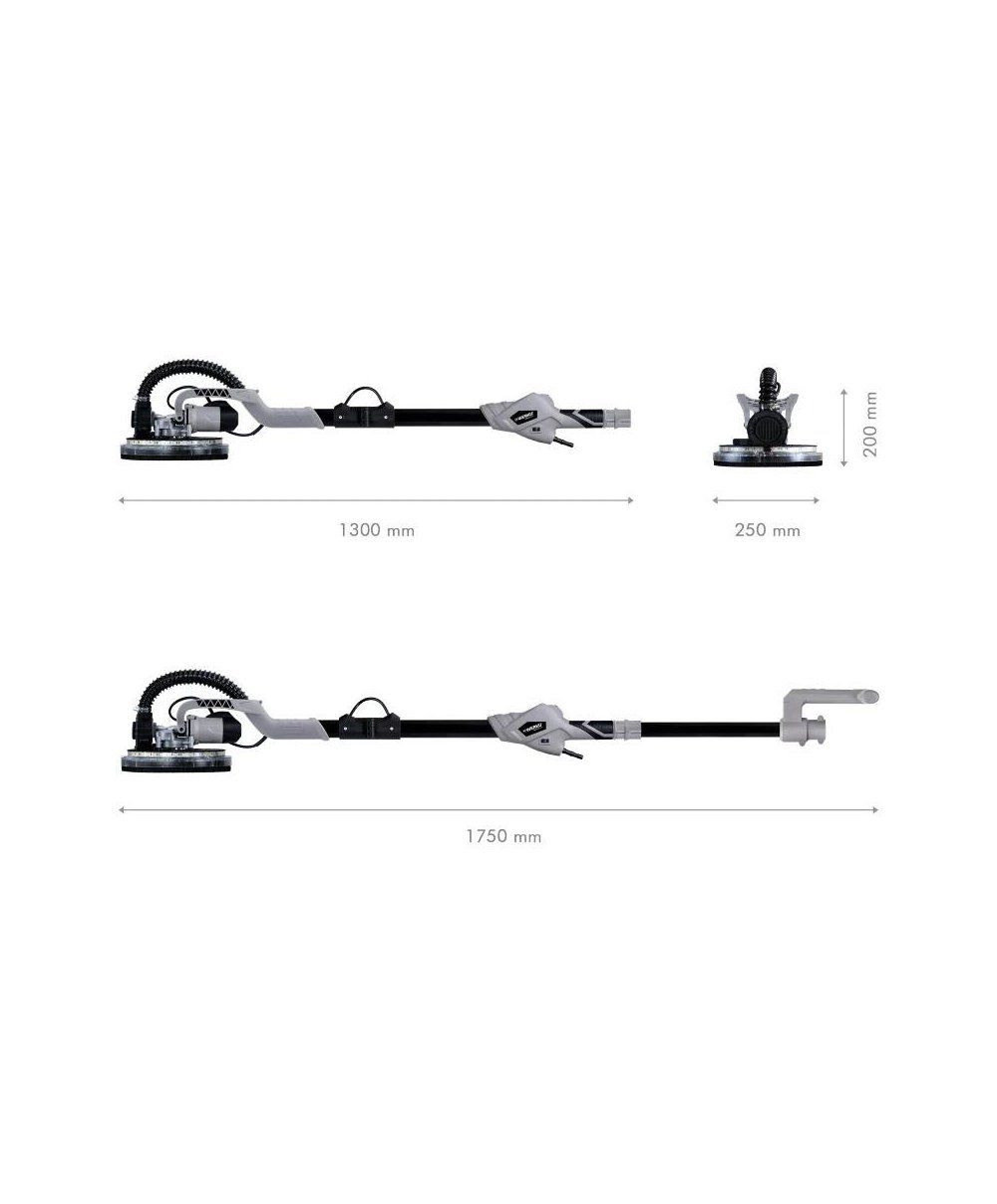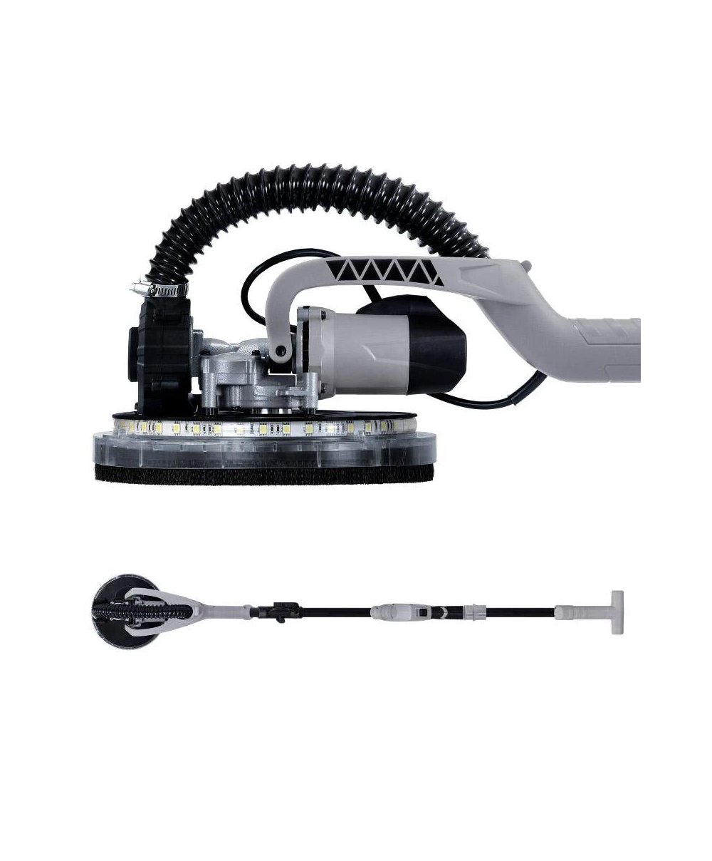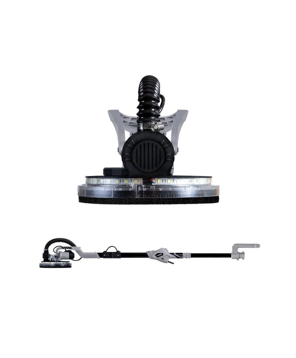 Potência de 750W, 1000-1850 rpm, 6 velocidades, diâmetro do disco de 225mm, comprimento ajustável de 1300-1800mm e cabeçote ajustável de 0-90 graus. Corpo em composto ABS e aço carbono, interruptor de botão de operação contínua, sistema de aspiração integrado compatível com aspirador de pó, cabo ergonômico antiderrapante, cabo auxiliar de apoio, seletor de 6 velocidades, sistema de luz de visão LED 360 graus integrado, fixação do disco em velcro, extensível e dobrável. Inclui 6 discos de lixa microperfurados de 225mm (grãos 60, 80, 120, 150, 180 e 220), mangueira de sucção de 1,5 metro, coletor de pó de 20 litros, alça para transporte, bolsa para transporte e manual de instruções em 7 idiomas (inglês, espanhol, alemão, francês, italiano, holandês e português). Excelente padrão de qualidade, durabilidade, resistência, sustentabilidade, design e inovação tecnológica.