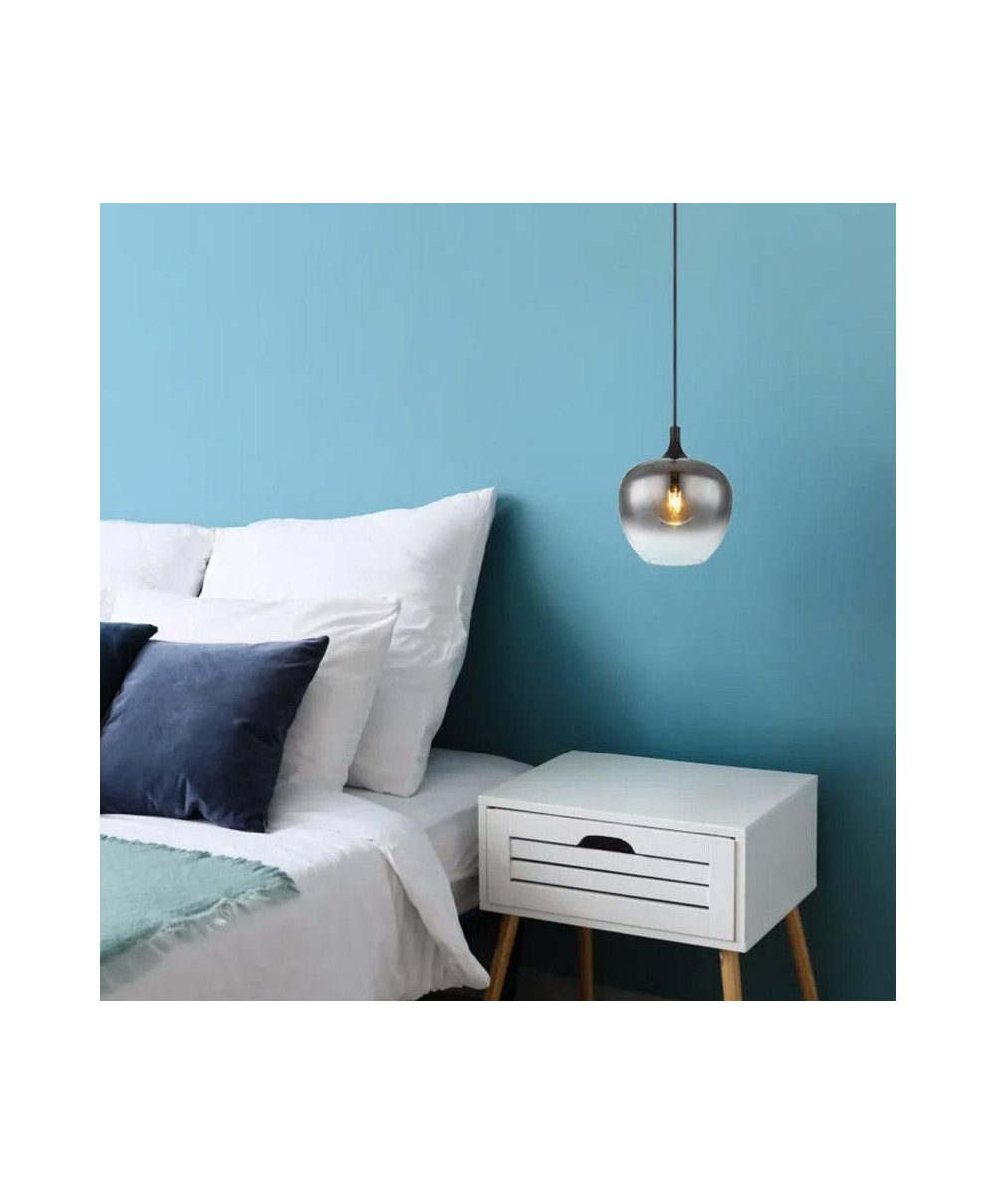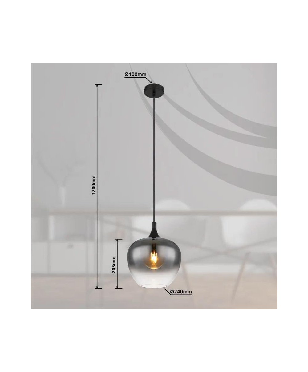 Este candeeiro conta com um suporte redondo no teto, um cabo de 1,2 m de comprimento que se estende até um soquete E27, equipado com cúpula de vidro fumê (Ø 24 cm). O soquete E27 permite-lhe definir a sua própria cor e intensidade de luz, com uma potência máxima de 40 watts. Para maior durabilidade e economia de energia, recomendamos lâmpadas de LED.