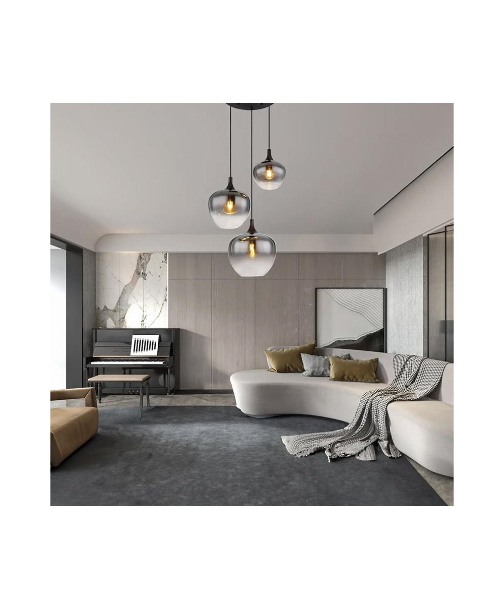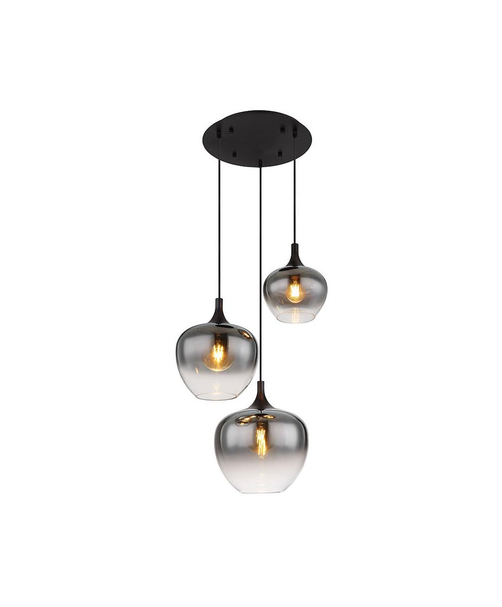 Este candeeiro eleva qualquer espaço devido ao seu design elegante. Perfeito para estar a decorar uma sala, um quarto ou qualquer outra divisão da casa. De um suporte redondo de teto (Ø 30 cm), saem três cabos de até 1,2 m de comprimento, em diferentes comprimentos, para um soquete E27 cada, equipados com telas de vidro fumê bem torneadas.