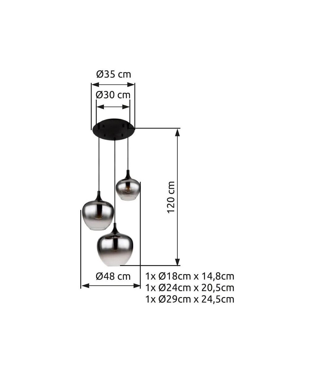 De um suporte redondo de teto (Ø 30 cm), saem três cabos de até 1,2 m de comprimento, em diferentes comprimentos, para um soquete E27 cada, equipados com telas de vidro fumê bem torneadas. O soquete E27 permite que você determine sua própria cor e brilho de luz, até uma potência máxima de 40 watts. Para maior durabilidade e economia de energia, recomendamos lâmpadas LED.