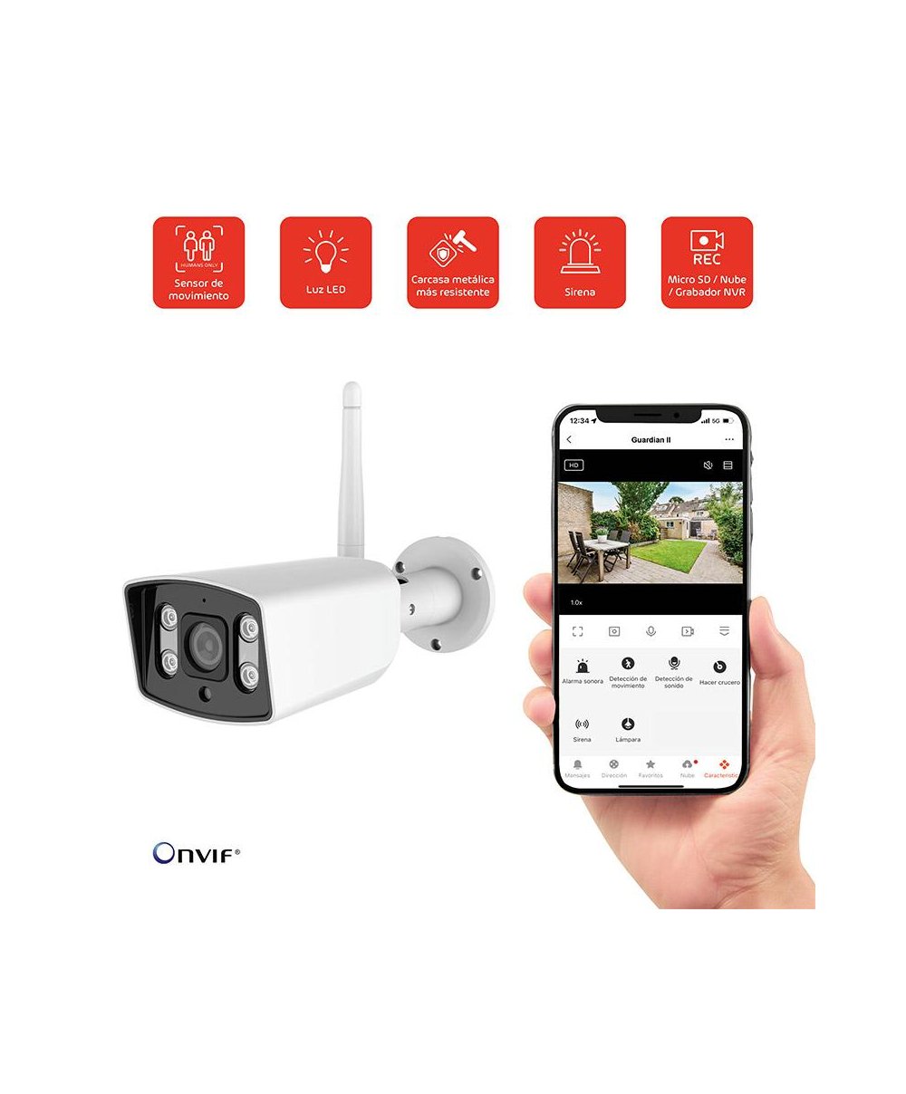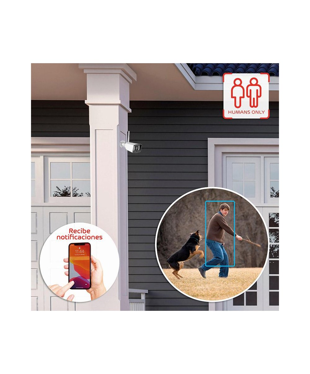 Câmera de vigilância externa, perfeita para monitorizar a sua casa, jardim, empresa, animais de estimação ou entes queridos. Instalação simples para visualização ao vivo. Opção de gravar imagens num cartão (não incluído) ou na nuvem (serviço pago). Áudio bidirecional. Alta resolução de imagem, ultra HD de 4 megapixels. Proteção IP66, visão noturna e visão de cores. Opção de enviar uma notificação quando houver detecção de movimento. Filtro humano e sirene. Detecção de som e luzes LED integradas.