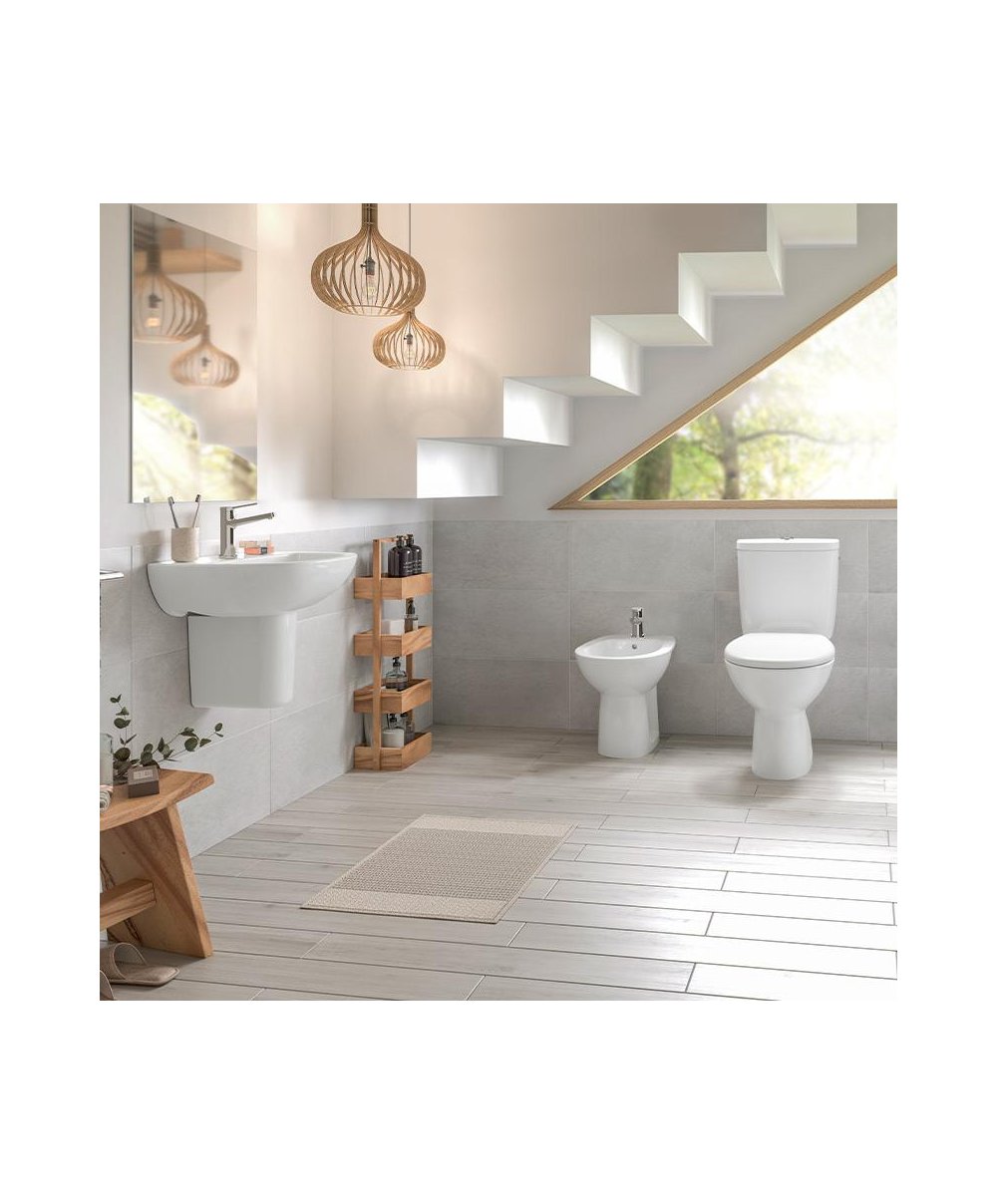 Esse conjunto oferece uma solução tanto econômica quanto sofisticada para a sua casa de banho. Esta sanita compacta possui uma saída vertical, enquanto o tanque compacto é alimentado por baixo e tem capacidade de descarga de 3/6 litros. As dimensões deste conjunto são 370 x 670 x 755mm, proporcionando uma opção compacta para espaços menores.