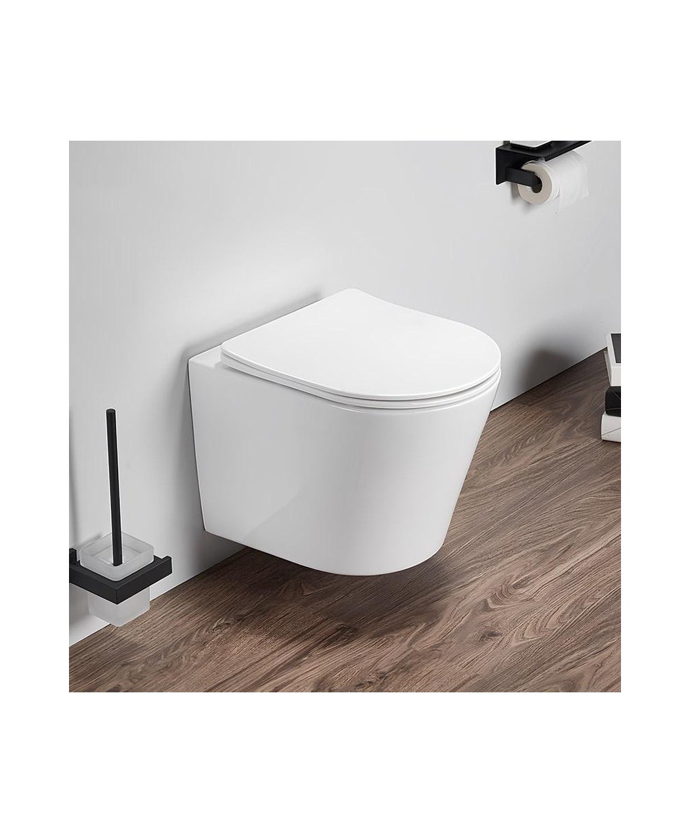 Conjunto de sanita suspensa Globe em cerâmica branca e acabamento de brilho, com sistema Rimless para uma limpeza mais fácil e higiénica. Design moderno e compacto, ideal para casas de banho contemporâneas.