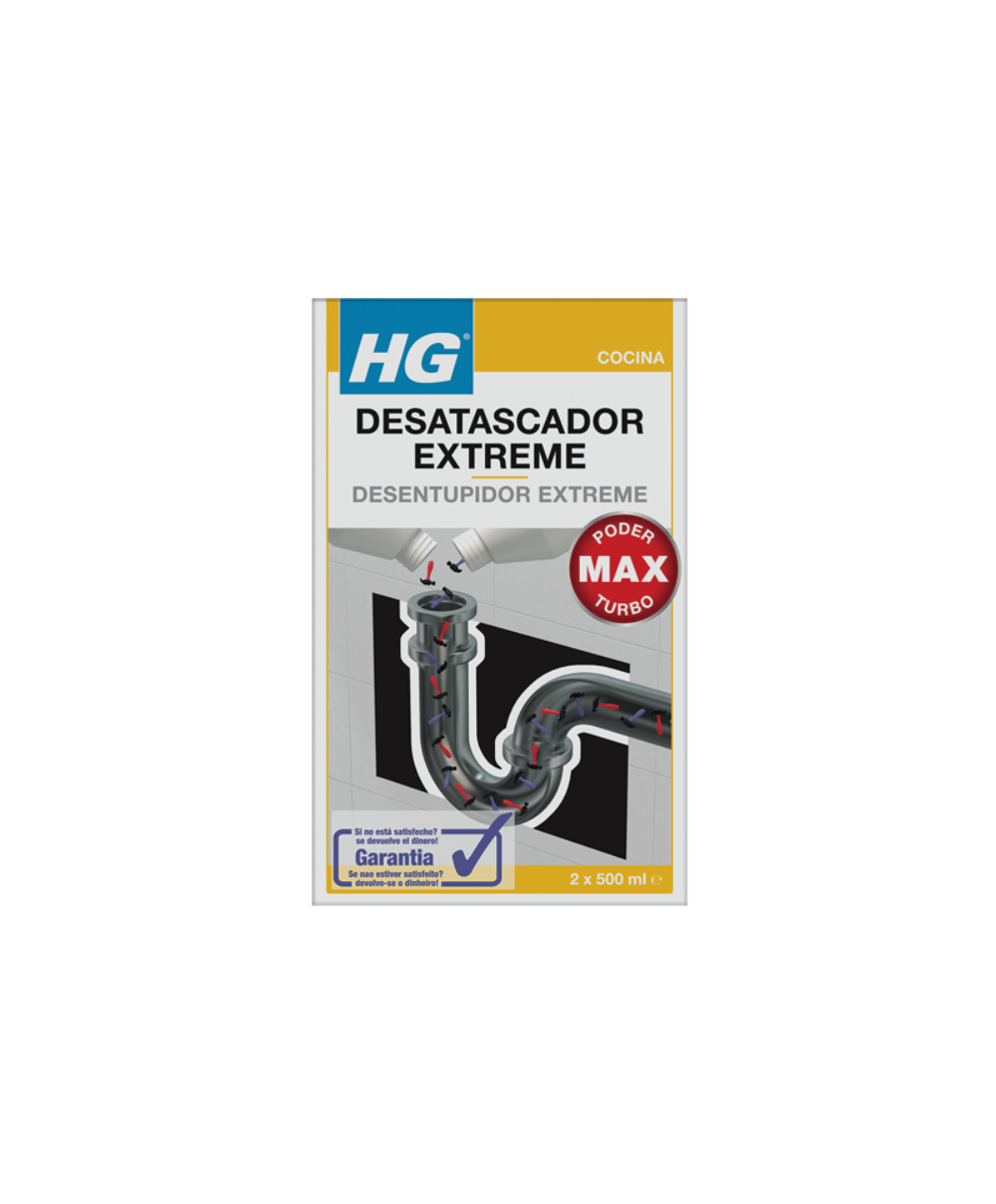 O Desentupidor Extreme HG é a solução definitiva para obstruções graves em canos, eficaz tanto em resíduos de gordura como de cabelo. Este conjunto de dois componentes funciona em conjunto para dissolver rapidamente as obstruções mais persistentes, garantindo um escoamento fluido e um desentupimento completo. Seguro para todos os tipos de canos.