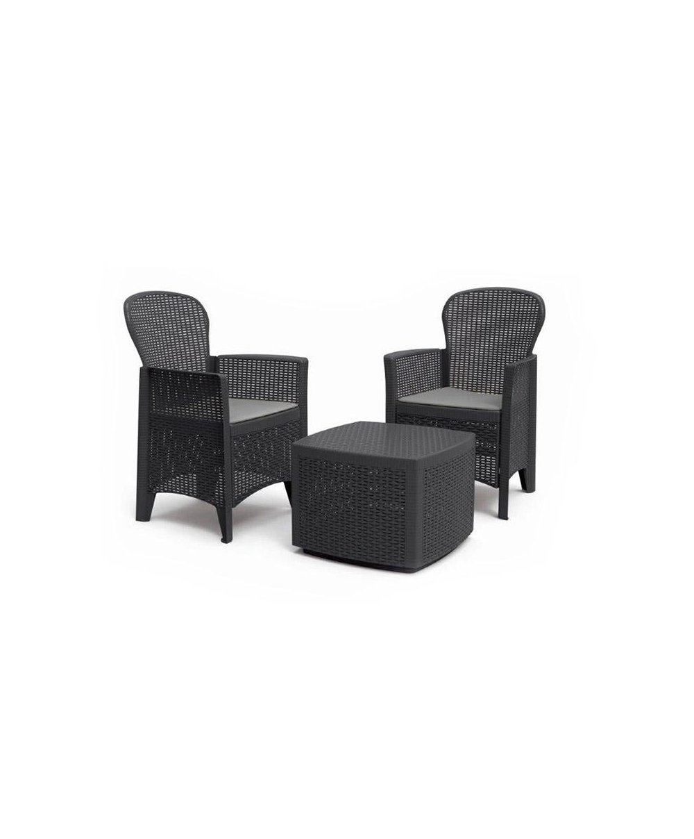 Conjunto de jardim Set Tree em antracite. Inclui mesa e 2 cadeiras empilháveis em resina resistente, ideal para varandas, terraços ou pequenos espaços exteriores.
