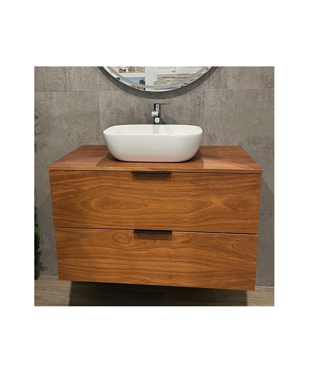 Móvel suspenso Salgar Etimoe de 90 cm com 2 gavetas espaçosas e tampo STD-16. Combina design moderno com um acabamento elegante em tom madeira, perfeito para criar uma casa de banho funcional e sofisticada.