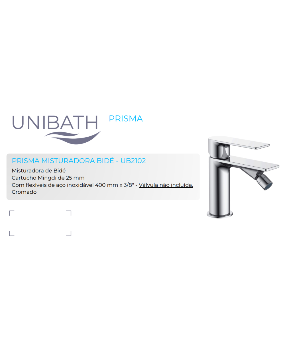 O Monocomando de Bidé Prisma cromado combina design moderno, durabilidade e suavidade no uso. Fabricado em latão com cartucho de 25 mm, inclui mangueiras flexíveis de 350 mm e garante um funcionamento fiável e perfeito para qualquer casa de banho.