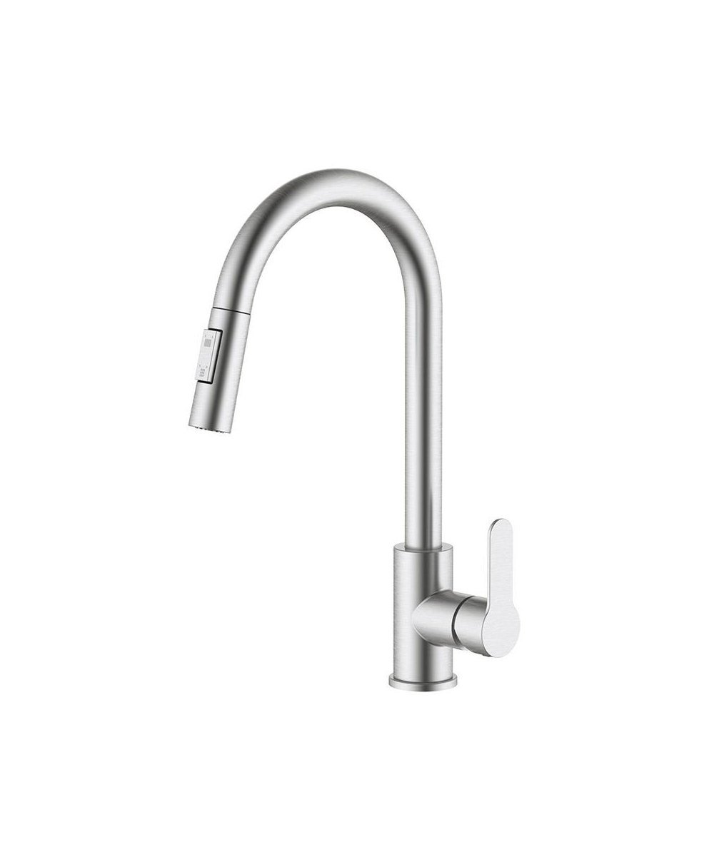 A torneira de cozinha em aço inoxidável com bica extraível alia design moderno à máxima funcionalidade.